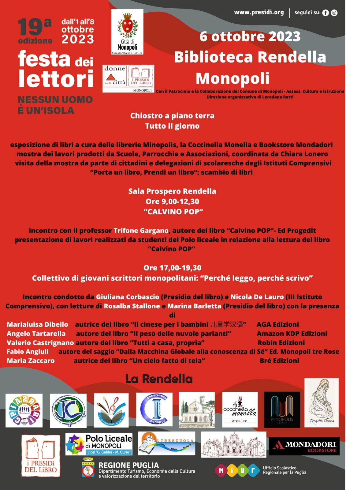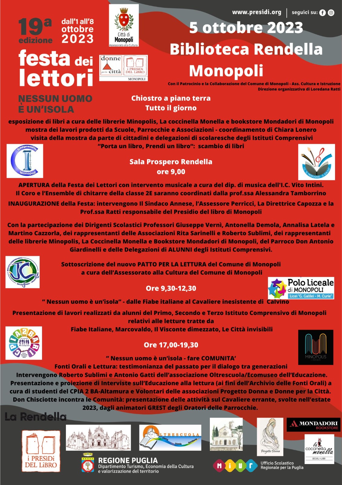 L'Assessore alla Cultura Rosanna Perricci comunica che il 5 e il 6 ottobre 2023 si terrà in Biblioteca Rendella la XIX Edizione della Festa dei Lettori a Monopoli, promossa dall'Associazione “Donne per la città – Presidio del Libro di Monopoli” e organizzata in collaborazione con l'Assessorato alla Cultura del Comune di Monopoli nei giorni 5 e 6 ottobre 2023.