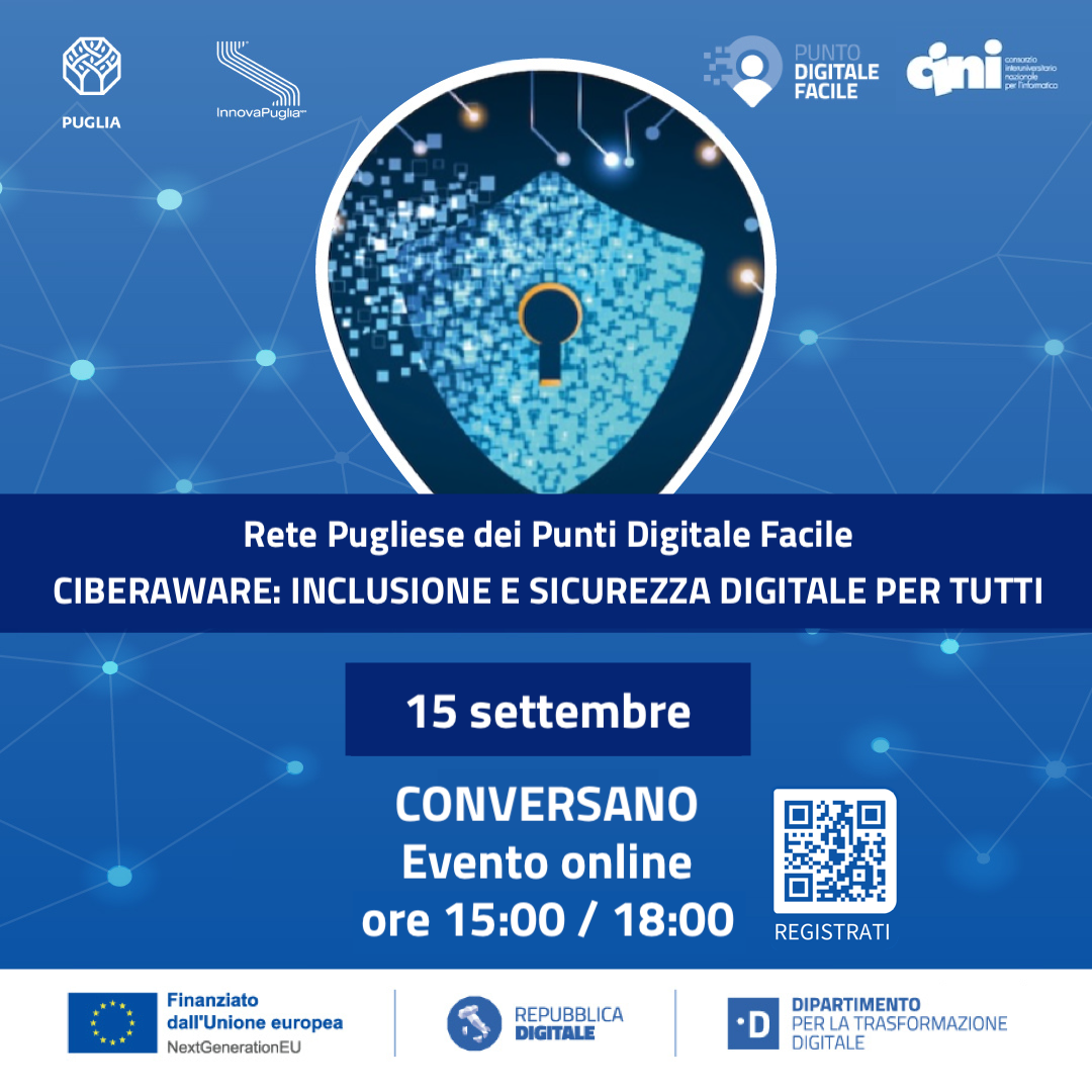 Il 15 settembre p.v. si terrà, in modalità online, il terzo webinar del progetto “CyberAware: Inclusione e Sicurezza Digitale per Tutti”, promosso dalla Regione Puglia, in collaborazione con il CINI - Consorzio Interuniversitario Nazionale per l’Informatica - e con il supporto della società in house regionale InnovaPuglia SpA, che farà tappa da settembre a dicembre, a Bari, Foggia e Taranto, per tre incontri in presenza, nonché ad Andria, Altamura e Massafra per tre incontri in modalità mista (in presenza e online), prevedendo inoltre otto webinar organizzati in collaborazione con i Comuni di Bitonto, Conversano, Martano, Poggiardo, Casarano, Troia, Grottaglie e Gagliano del Capo.
