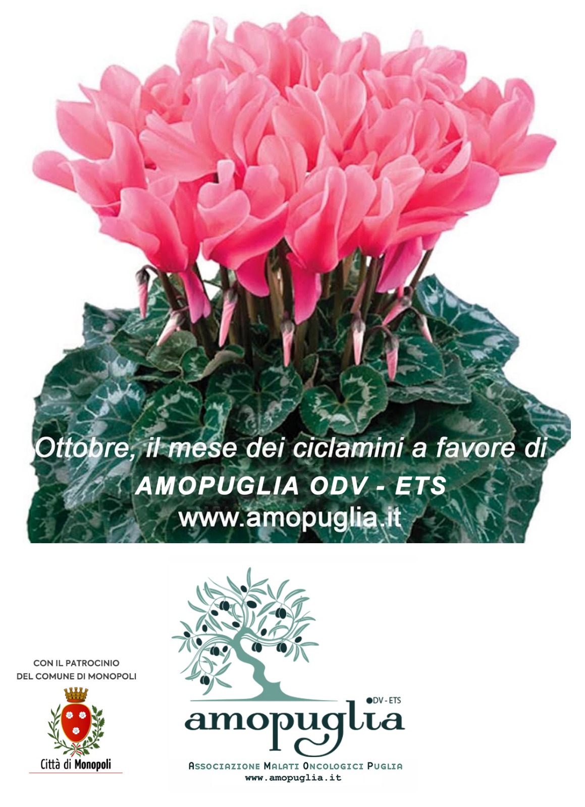 L’amopuglia sezione di Monopoli rilancia la campagna di sensibilizzazione per la raccolta di fondi a sostegno dell’Unità di cure Palliative dell’Hospice San Camillo di Monopoli, attraverso la vendita delle piante di ciclamino. I volontari saranno presenti in P.zza Vittorio Emanuele nella giornata di sabato 25 e nella mattinata di domenica 26 ottobre.