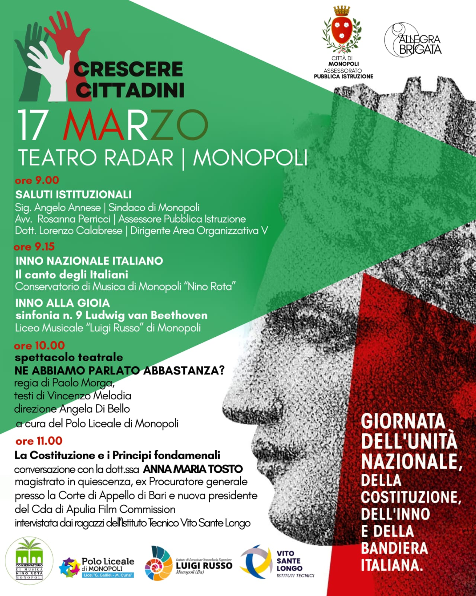 L’iniziativa coinvolge diverse istituzioni scolastiche cittadine – tra cui il Conservatorio di Musica Nino Rota, il Polo Liceale di Monopoli, il Liceo Musicale Luigi Russo e l’Istituto Tecnico Vito Sante Longo – e rappresenta un’importante occasione educativa per promuovere tra i giovani la conoscenza dei valori costituzionali, della storia nazionale e del senso di appartenenza alla comunità.