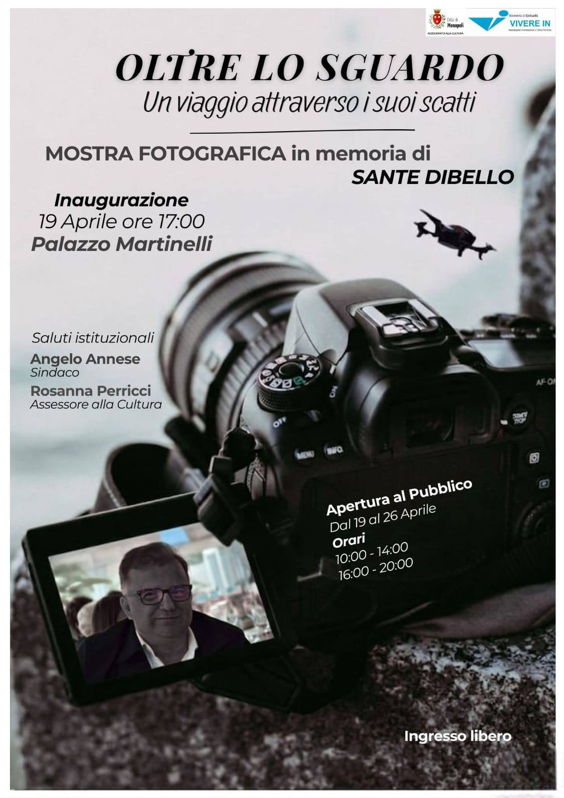 La mostra si propone come un percorso visivo che attraversa la sensibilità di Sante per anni anima creativa del Movimento “Vivere In”, contribuendo a elevare la comunicazione della spiritualità attraverso l’arte del design e della fotografia. L’esposizione non è soltanto una rassegna di opere, ma un momento di riflessione condivisa sull’eredità umana e professionale di un artista della nostra città. L’iniziativa, promossa dal Movimento “Vivere In” in collaborazione con la famiglia del commiato, unisce la celebrazione del ricordo a un gesto concreto di altruismo. In occasione della mostra, infatti, la famiglia Dibello ha scelto di onorare la memoria del proprio caro attraverso una donazione a favore dello stesso movimento, associazione di diritto pontificio, a testimonianza di quel legame profondo tra impegno sociale e arte del dono che ha contraddistinto l’intera vita di Sante.