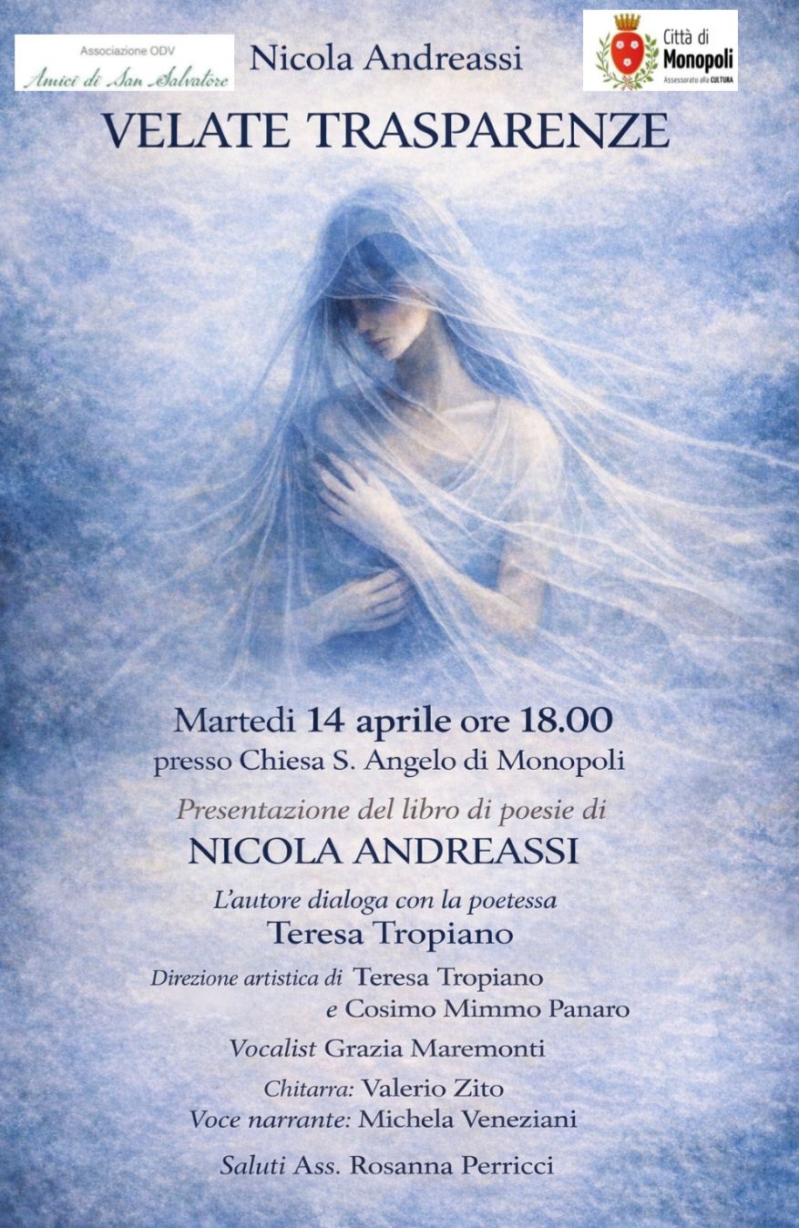 Nella straordinaria cornice della Chiesa di Sant'Angelo a Monopoli, l’autore barese Nicola Andreassi presenterà la sua silloge poetica “Velate trasparenze”, una raccolta che si muove sul confine tra ciò che appare e ciò che resta nascosto, tra il dire e il silenzio. Un libro da attraversare con lentezza, per chi sa che le verità più profonde non si mostrano mai completamente, ma continuano a farsi sentire.