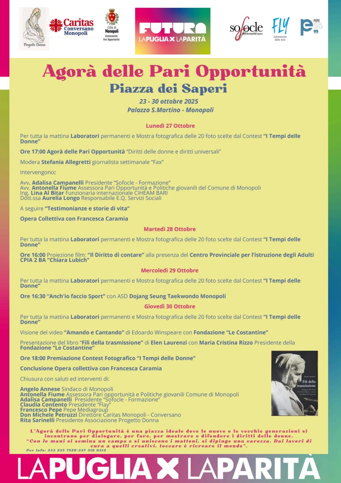 L’associazione Progetto Donna ha ideato un progetto superando il bando FUTURA LA PUGLIA PER LA PARITA’ del consiglio Regionale per dialogare anche con i giovani sulla parità di genere, la rinascita economica femminile nel territorio anche attraverso la riscoperta di arti e mesterei del passato.
