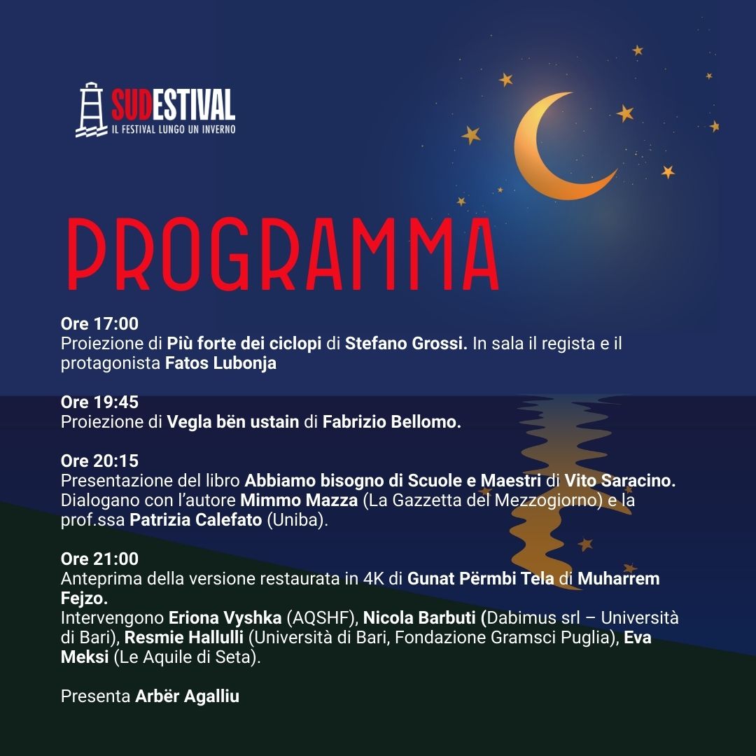 Il festival vivrà nuovamente anche la propria dimensione internazionale: novità della scorsa edizione, figlia di un legame storico, sociale e culturale sedimentato con lo sbarco del 1991, è il focus sull’Albania, previsto per il 13 marzo con la proiezione del film Gunat Përmbi Tela di Muharrem Fejzo, restaurato a cura della Fondazione Gramsci di Puglia e in collaborazione con AQSHF – Faqja zyrtare e Arkivit Qendror Shtetëror të Filmit, e Più forte dei ciclopi di Stefano Grossi, in Italia, al Sudestival, dopo essere stato presentato in anteprima internazionale durante l’ultimo Tirana International Film Festival.