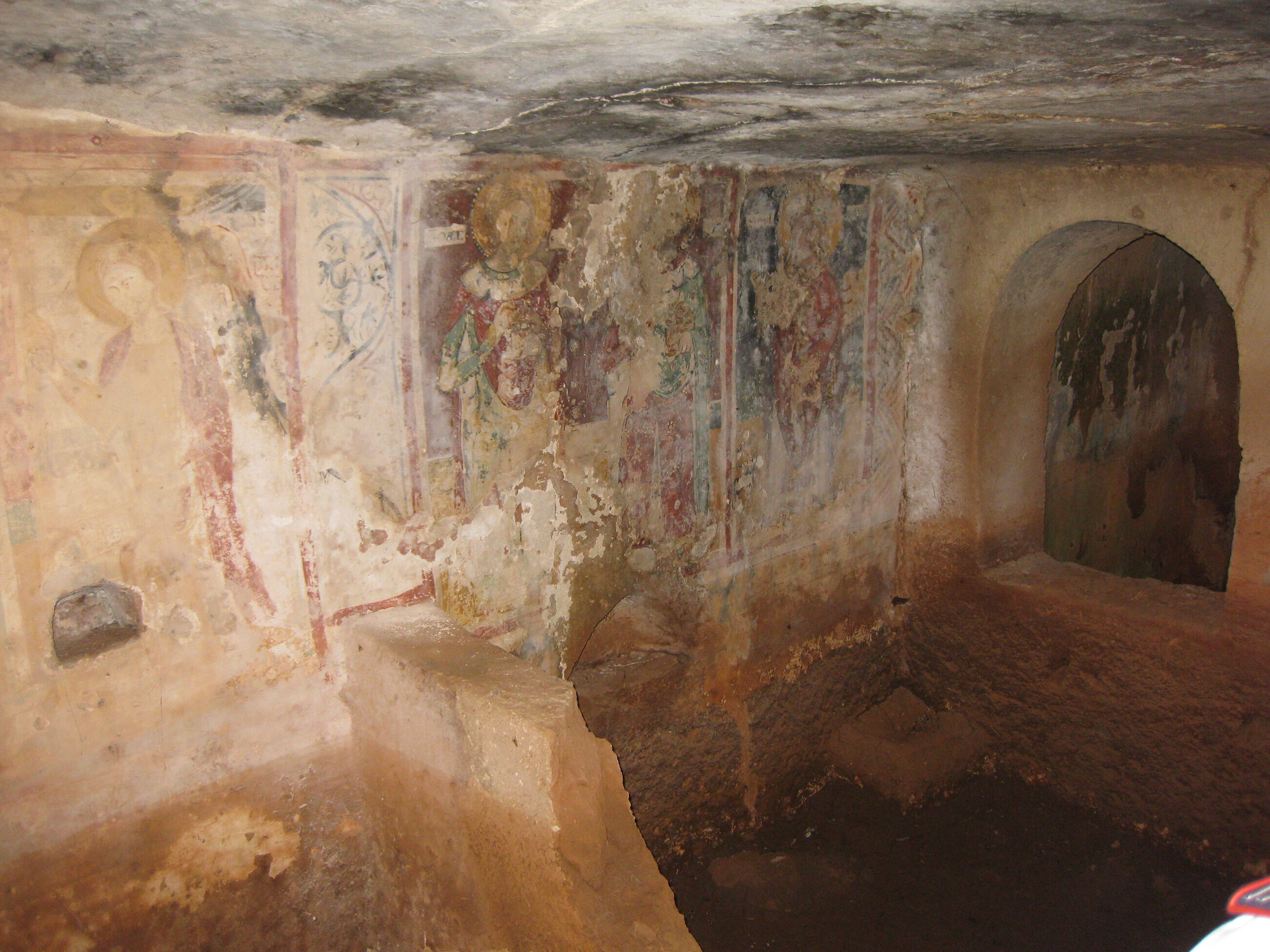 The cave-church, isolated compared to the rest of the settlement, has a triforium entrance and a remarkable set of frescoes in its interior: St. George, remains of St. Anthony Abbot, SS. Cosmas and Damiano, St. Eligius, Deesis, St. Leonard, Virgin enthroned, SS. Peter and Paul, remains of a Holy Queen and a scene of the Annunciation.
